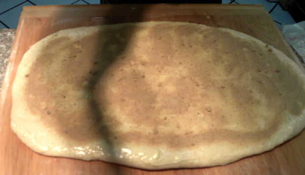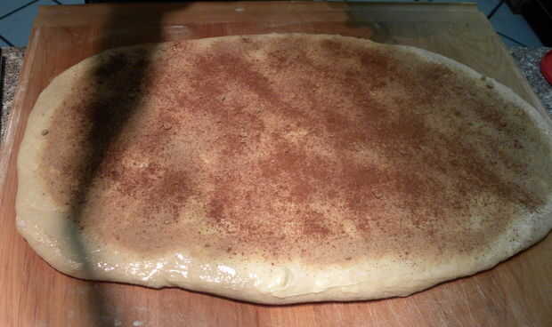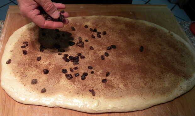 Tomar la mantequilla reblandecida y difundirlo en toda la superficie del rectángulo. Ahora espolvorea uniformemente el azúcar moreno toda la mantequilla. Hacer lo mismo con la canela. Utilice más canela si te gusta, es difícil conseguir demasiado allí. Posible, pero difícil. Ahora bien, si desea puede colocar un puñado de pasas aquí demasiado. Me gusta las pasas de uva pero algunas personas no. Mi hermana les llama bugs. Ella siempre ha sido un poco loco cuando se trata de su comida aunque.
