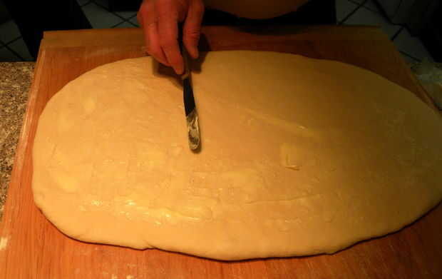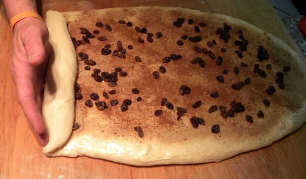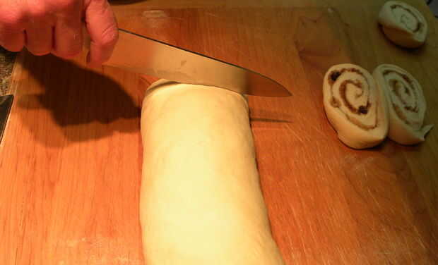 ¿Deja el rodillo esta arriba ok? A partir de uno de los lados largos, enrollar la masa en un registro. Ponlo con la costura hacia abajo en el centro de la superficie de trabajo. Rebanar el registro en rebanadas de una pulgada.