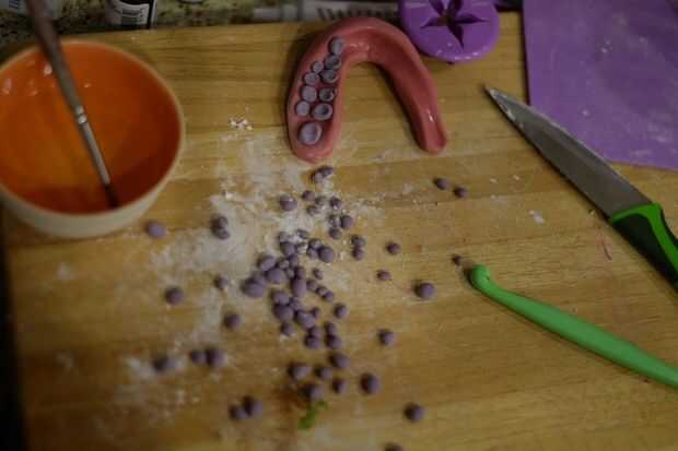 2 estirar varios tamaños de tentáculos de calamar con su pal. Esto es similar a lo que su promedio juega forma de serpiente de doh. Forma cónica un lado y con el lado del dedo hacen una muesca justo por en medio del tentáculo. Los rizos en diferentes formas para evocar los movimientos cefalópodos.