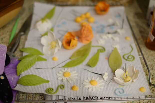 - Las pequeñas flores azules y blancas fueron hechas por presionar pasta de goma en un típico wilton molde y apareciendo un alambre enganchado en el centro de la flor. éstos fueron hechos en racimos con cinta floral. ser cinta floral seguro que a utilizado alimentos.