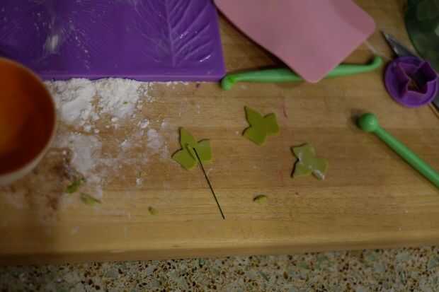 - Hojas de hiedra y otras hojas se pueden recortar con formas de cortador de galleta y utilizados tal cual o con un pequeño alambre floral. Para fijar el alambre floral a finas piezas sólo tiene que utilizar una pequeña pizca extra de pasta de goma en la parte posterior.