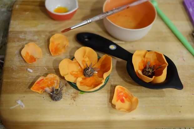 - Amapolas fueron hechas al igual que el rosal silvestre pero que rodé el estilo en real de amapola. Yup! Muy bien. También mezclé un poco de gel colorante y agua hasta el cepillo en los pétalos para agregar variación de color. Dejo secar en las tapas de tarro y en la medición de tazas para tener variación en las formas de la floración.