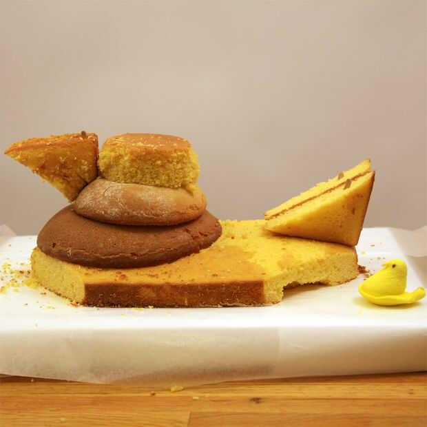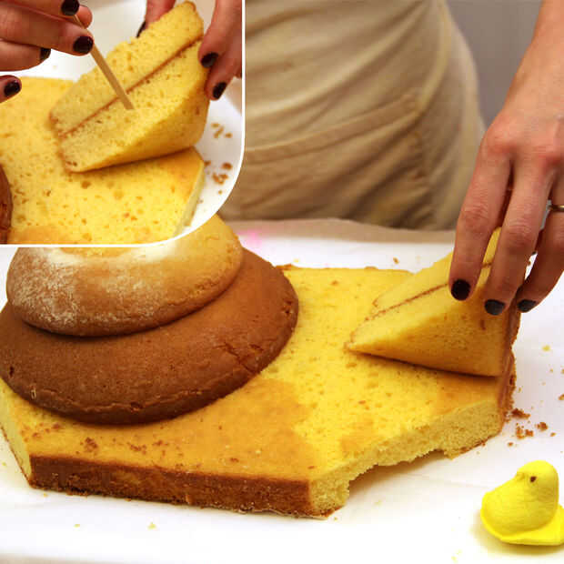 El verdadero truco para acertar con la forma aquí no es centro de cada una de las tortas redondeos encima de la otra, sino alinear las partes posterioras de los redondos por lo que parece la peep está tirando su cabeza hacia atrás ligeramente. Esto me tomó varios intentos para conseguir derecha.