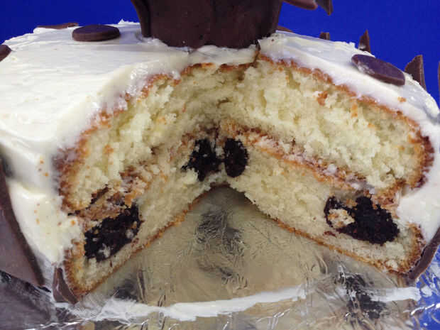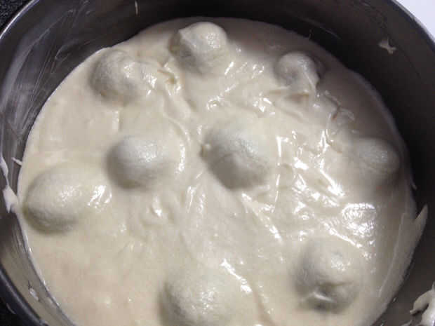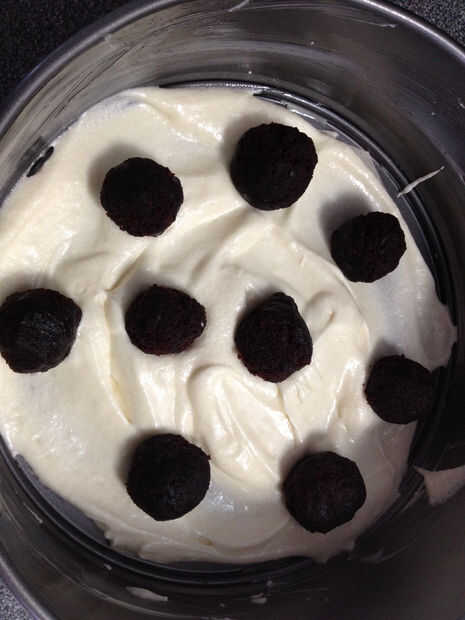 Por último agregue la leche hasta que la masa quede lisa. Vierta la masa un poco en pan, dejar caer bolas de pastel de chocolate, luego verter el resto de la masa de vainilla cubriendo las bolas de chocolate