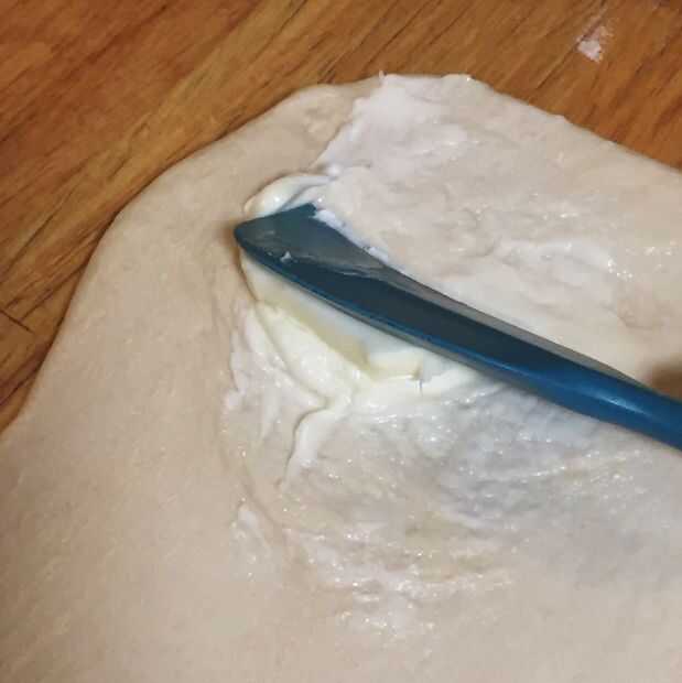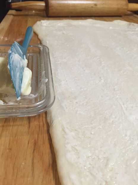 Unte la masa con mantequilla suave. Ir casi hasta los bordes.