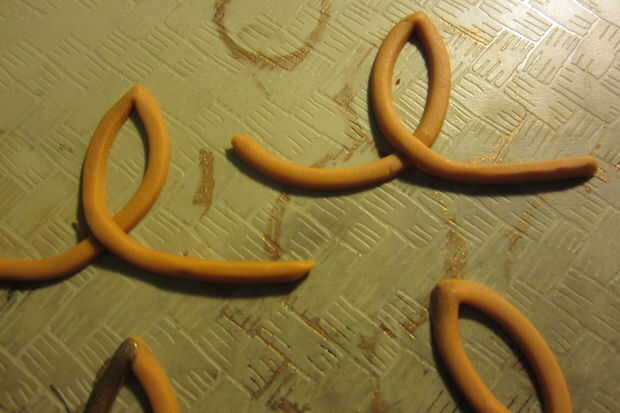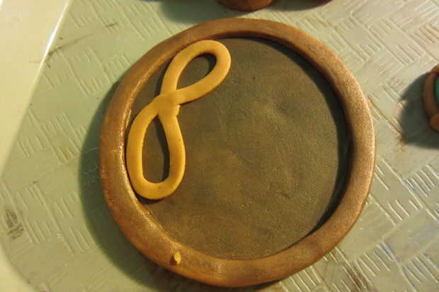 Para hacer los lazos acentuados que sentarse encima de estos símbolos de infinito, esbozar la forma en un trozo de papel, asegurándose de que está a escala con el resto del amuleto. Mezclar en CMC extra a esta porción de tu fondant--porque va a estar suspendido sobre los bordes, tiene que ser extra duro. Corte tiras delgadas como antes. Formar cada bucle sobre el dibujo para asegurarse de que son del mismo tamaño y forma, luego deslice el papel sobre una bandeja. Deje que estas seco * totalmente *, preferiblemente durante la noche. Impaciente no hizo esto y hay leve marchitez en el producto final debido a él.