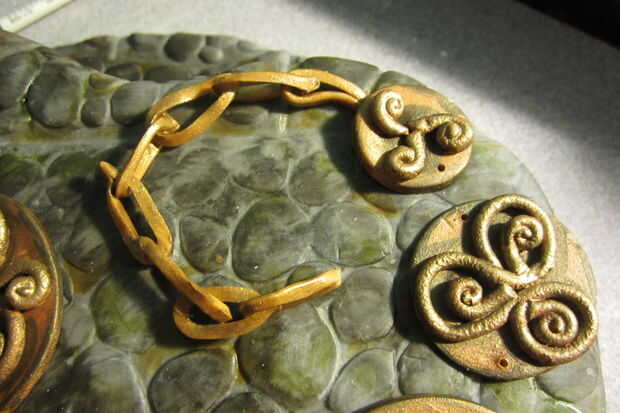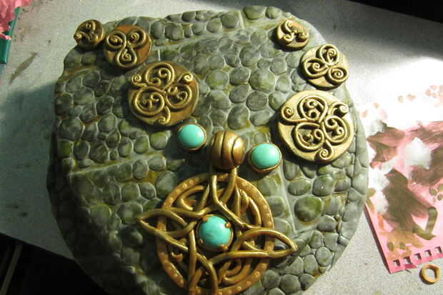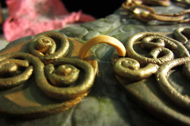 Por último, tomar sus anillas y cortarlas aproximadamente en la mitad. Asomó pequeños agujeros donde quería las anillas para "conectar" las piezas. pero usted puede marcar los puntos pero te gusta. Con un pequeño toque de agua, de pie los anillos de salto con cada extremo tocando uno de sus marcas. Corte un pequeño pedazo del anillo y cuña entre las piezas del amuleto contra el pastel para dar la ilusión de que el anillo pasa a través de todo el camino. (No tomar una fotografía de este último paso, lamentablemente D:)
