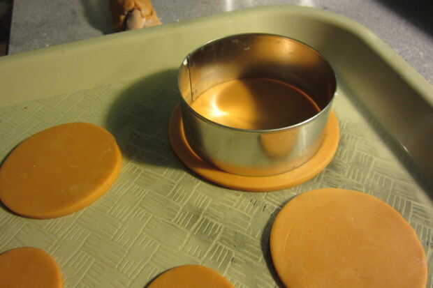 Tomar uno de tus círculos para el amuleto y cortar un círculo en su interior, dejando una gran forma de "O" abierta. Esto irá en la parte superior del otro círculo como una frontera. Usted quiere hacer este corte, una vez que la pieza ya está en la bandeja, porque levantar una forma O hueco hecha de fondant fresco sólo pide que estirar fuera de forma.