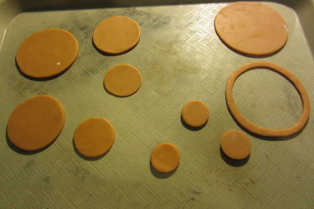 Espolvorear la superficie de trabajo con fécula de maíz. Estirar el fondant para 1/6"- 1/4". El amuleto es una pieza bastante abundante por lo que no debe ser demasiado fino y delicado. Cortar todas las piezas, deje secar durante 5-10 minutos antes de pasar a los que son de mantener su forma. Colocarlos en una bandeja que puede definir a un lado y seguir trabajando. No dude en hacer un par de extras en caso de accidentes.