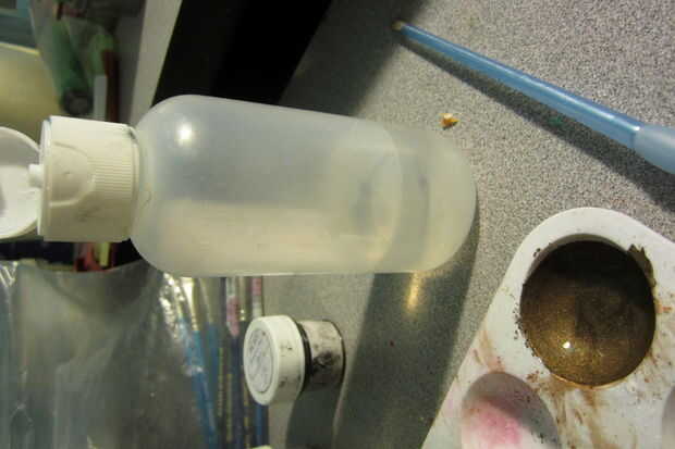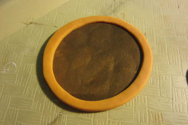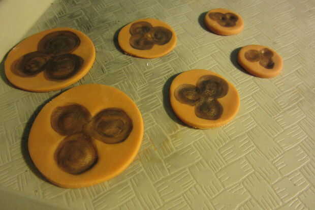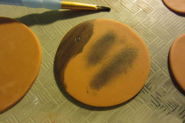 Es importante ver lo que el color parece en el fondant en sí mismo, así que utilice una de las piezas extras cortado para ver si el color necesita ajuste. Pintar la parte inferior del amuleto, tres círculos en cada una de las placas y las líneas de profundidad en la pieza de conexión con su oro oscuro.