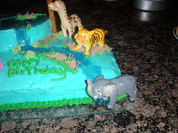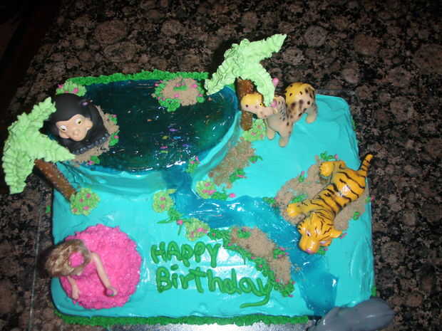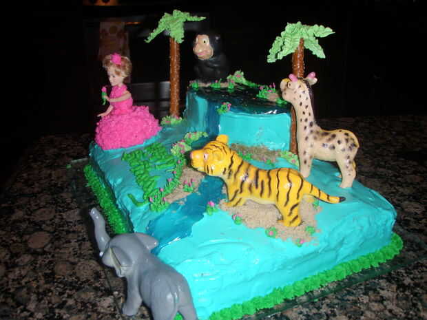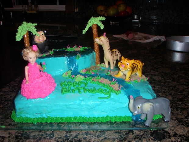 Utilicé el gel de tuberías para el agua y el azúcar marrón de la arena. Usé glaseado real para el glaseado decorar (la hierba, el vestido de las niñas y las copas de árboles de Palma) y acababa de usar una mezcla de crema batida, queso crema, azúcar en polvo y leche condensada para que el glaseado normal. Para las palmeras usé una barra de pretzel y razón por la cual tiene su forma de glacé real.
