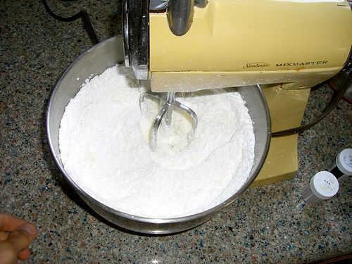 En una batidora Creme la mantequilla (temperatura ambiente) y acortamiento (o leche si usted optar por no utilizar manteca * ver ingredientes en el paso 1) por unos 2 minutos hasta ligero y mullido. Añadir la vainilla y la clara de huevo y batir hasta que liviana y esponjosa. Agregue lentamente el azúcar 1 taza hasta que se incorpora a la mezcla de mantequilla. (5-10 minutos).