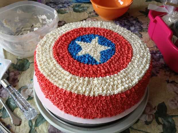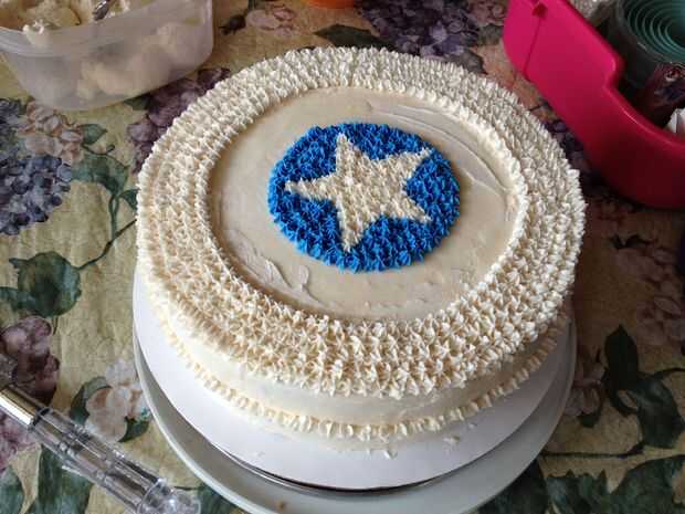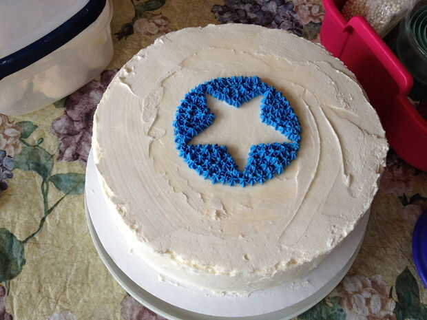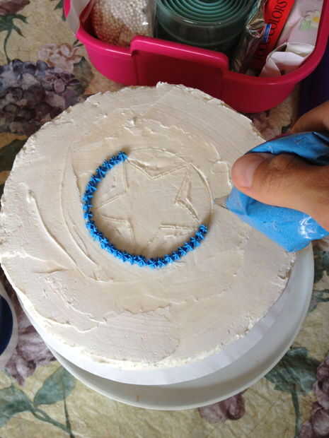 Usando un cortador de galletas forma estrellas y bolas de tamaño diferente (o cualquier cosa circular) traza a un patrón a seguir para la decoración de tu pastel. Luego tener en él! Observe cómo salvé rojo para el final por lo que sólo podía usar glaseado restantes todos cuando se mezcla con los colores de gel de alimentos.