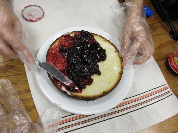 Usando un cuchillo de mesa, extiende la mermelada sobre la tarta inferior sobre