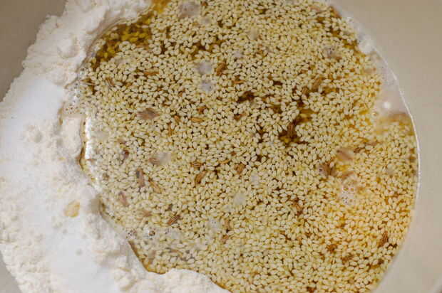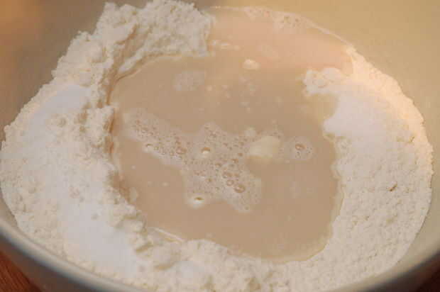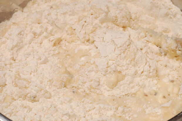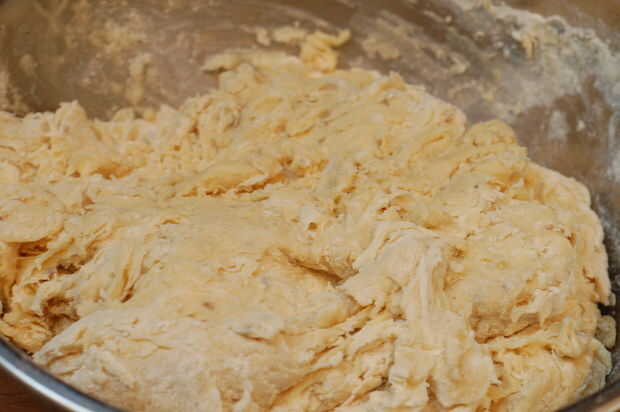 Mezclar hasta tener una masa áspera y resultan el contador. La superficie de la harina Si es necesario y amasen la pasta hasta liso y sedoso.