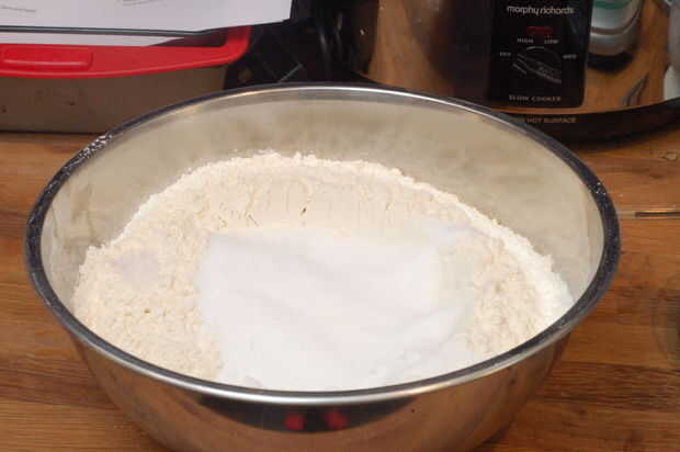 Coloca la masa en un bol grande, cubrir con film transparente y un paño limpio y dejar para alrededor de una hora hasta que se duplica en tamaño.