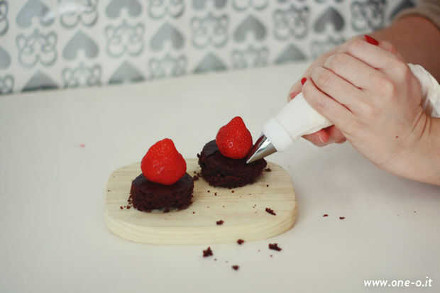 Una fresa y luego coloque boca abajo y por último decorar con crema usando la Manga pastelera.