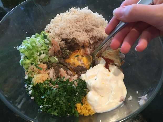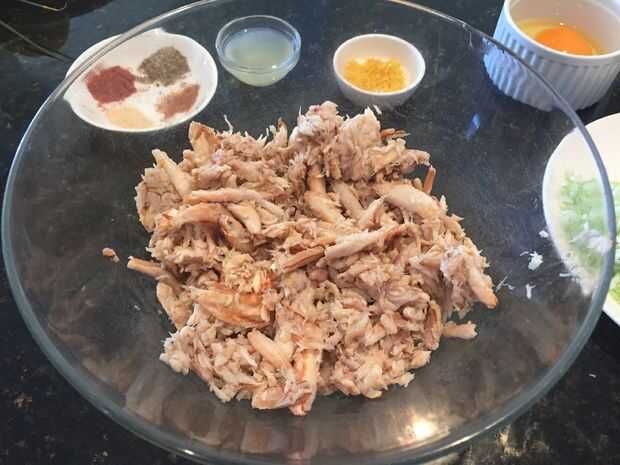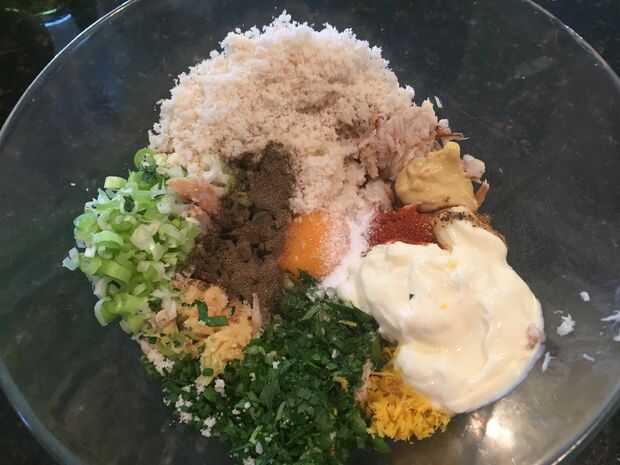Primer lugar la carne de cangrejo en el recipiente, seguido por el huevo, cebolleta, ralladura de limón y jugo, mayonesa, pan rallado fresco y hierbas especias. Luego mezclarlo todo hasta que se combina bien.