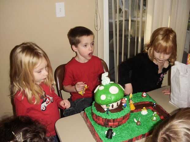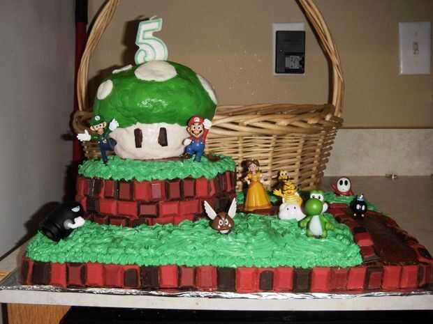 Torta de Mario - es 9 x dos 13 tortas para la base y dos tortas redondas para la parte superior. La seta es arroz Krispies trata que moldeada en la seta, se congeló y luego se cubre con un fondant de marshmellow. Compré al Mario figuras para ir sobre la torta. Utilicé chocolate y baño de vainilla teñido de verde para adornar con. Los rectángulos que utilizan como ladrillos son chocolates que he teñido y utiliza un diamante molde para hacer.