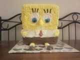 Bob esponja - tres tortas apiladas, utilicé un molde de pan, corte de las tapas para que no caen y entonces los apilados. Entonces usé glaseado de vainilla para su camisa y las otras partes se tiñen para decorar con, y sus pantalones son chocolate glaseado. Las pestañas son un palo de regaliz negro corte.
