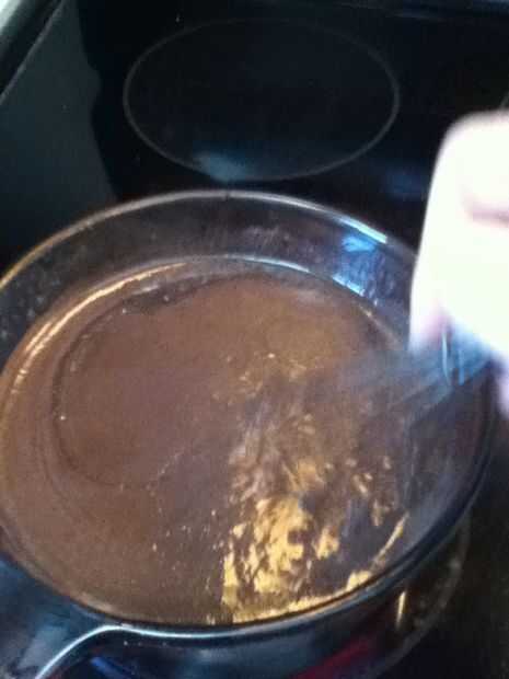 En una cacerola mediana, bata la leche, la mantequilla y el cacao hasta que la mantequilla se derrita completamente y la mezcla se convierte en smoooth.  Mezcla a los ingredientes secos, luego agregue los huevos y la vainilla.