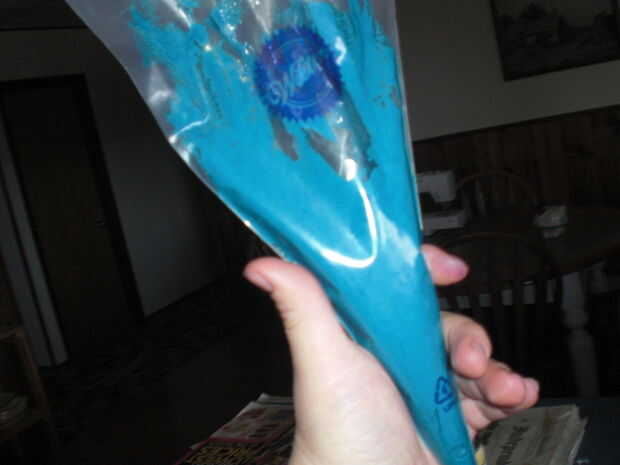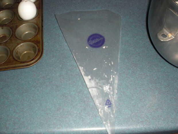 Ahora toma esa bolsa decoración (punta pequeña si es un ajustable.) y llenar la mitad para arriba. Coloque el punto pequeño en el agujero en la parte inferior del huevo.