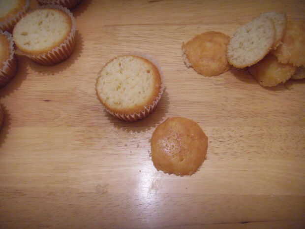 Cortar las tapas de todos los cupcakes para que sean planos (si son muy planos para comenzar con usted puede omitir este paso), extender una pequeña cantidad de mermelada sobre cada cupcake (lo suficiente como para pegar la cubierta, demasiado podría manchar a los bordes mientras estás decorando!).