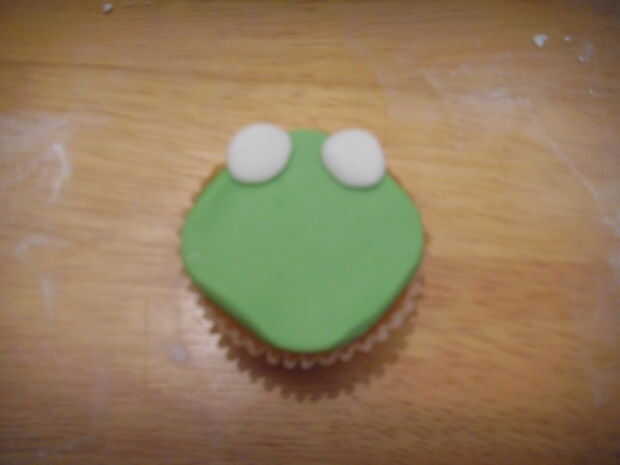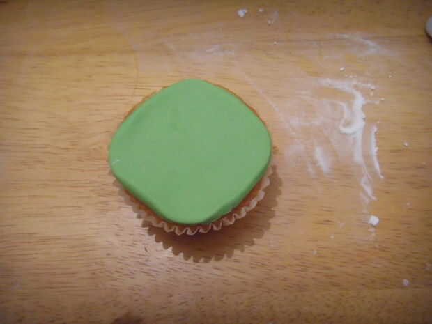 Pegar las piezas en el centro superior de la torta con un espacio entre ellos.