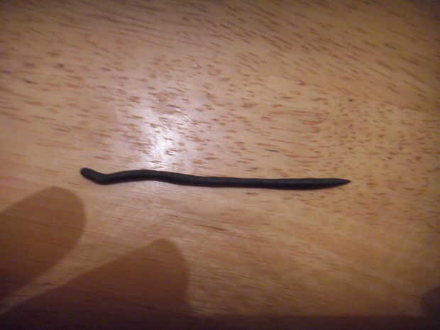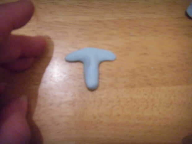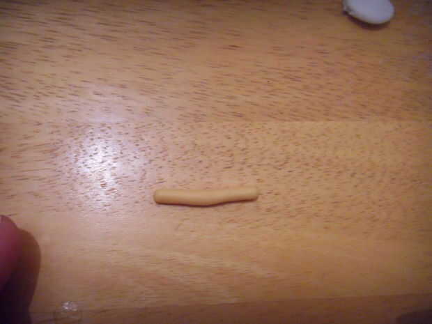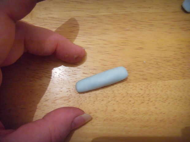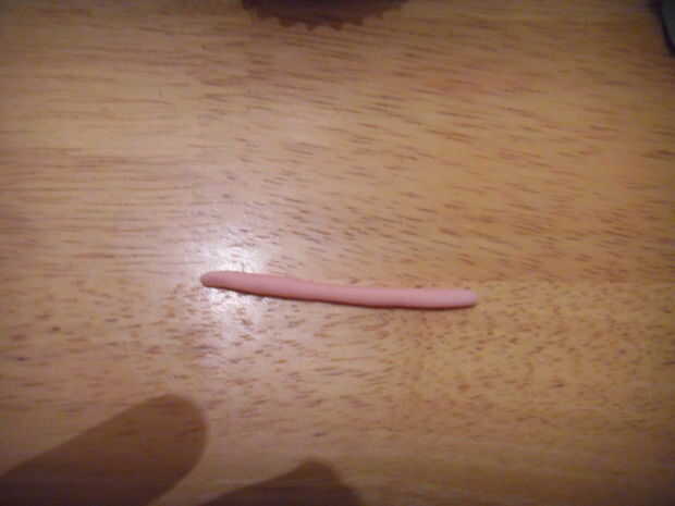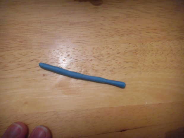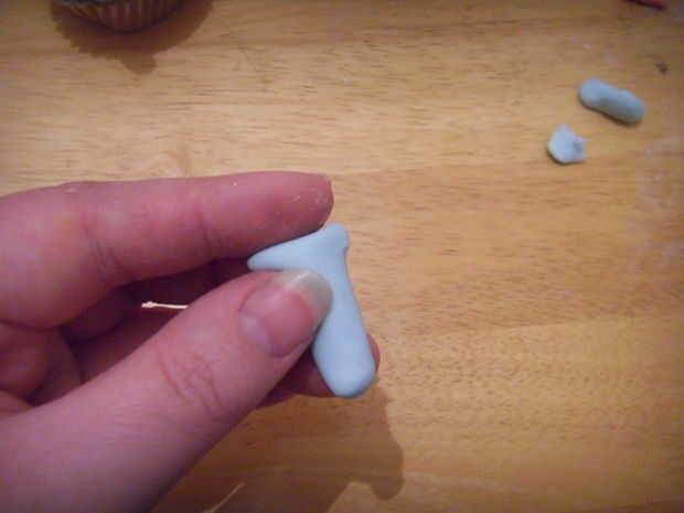 Rodar una gruesa y azul 'salchicha' de pasta de azúcar. Squash en un extremo. Aplanar el extremo para que toda la obra es ' t ' en forma, pero la sección principal todavía está alrededor.