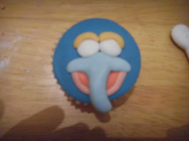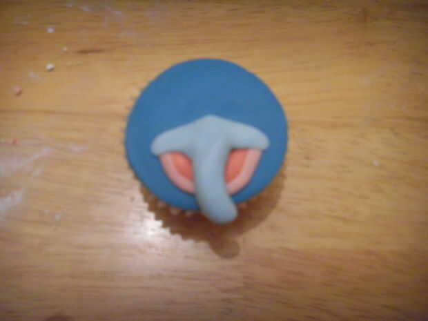 Cubre el cupcake en azul. Extienda una pequeña cantidad de pasta de azúcar color de rosa. Corte tenía un color de rosa pequeño '.
