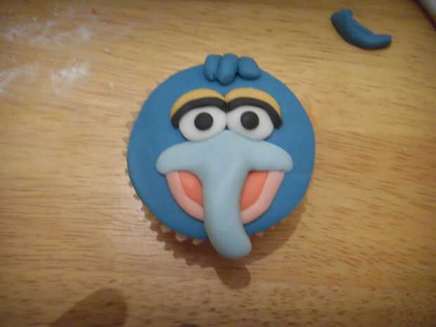 Rollo una fina salchicha de pasta de azúcar negra. Esto pegar sobre los ojos donde se unen el párpado y el ojo. Recorte el exceso. Rollo 2 muy pequeñas bolitas de pasta de azúcar negro y pégalos en como globos oculares. Desplegar un 'chorizo' de pasta de azúcar azul. Corte en 3.