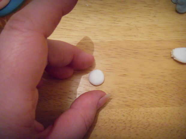 Rollo de 2 Bolitas blancas para los ojos. Extienda un amarillo salchicha de pasta de azúcar para los párpados. Corte la 'salchicha' en palillo medio, cada mitad sobre un ojo y recorte el exceso.