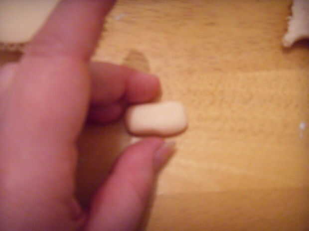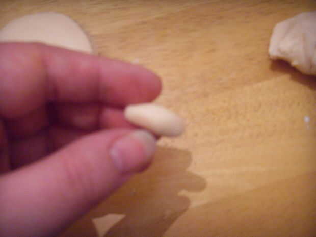 Aplastar una bola de pasta de color de la piel en forma de cacahuete y aplanar.