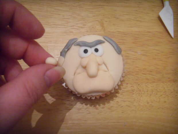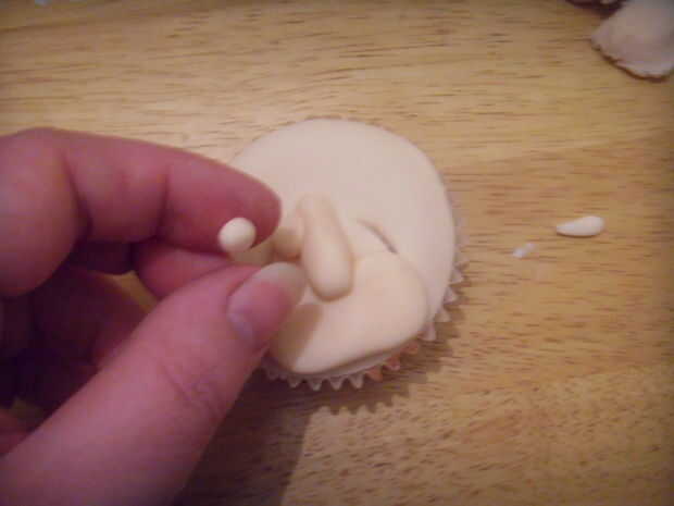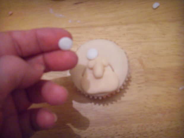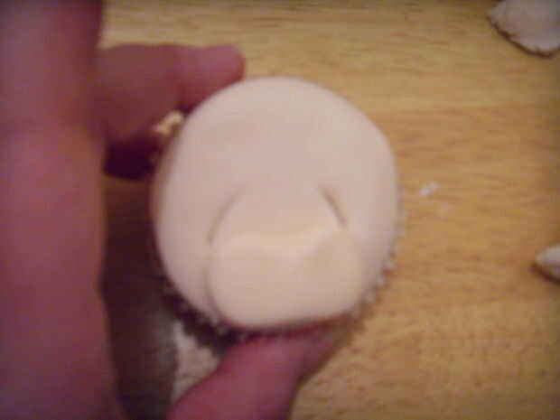 2 bolas de color de la piel del rodillo goma para oídos, palillo en la torta y marcar los centros con la bola de herramienta de modelado.