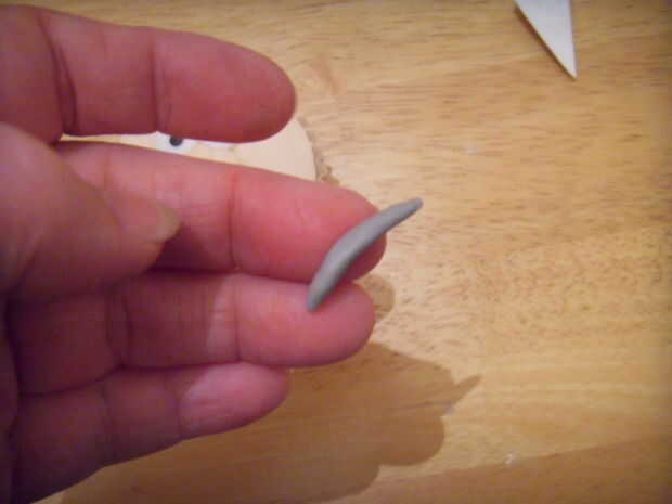 Rodar una ' salchicha de pasta gris. Palillo de la goma gris sobre los ojos para hacer una ceja.