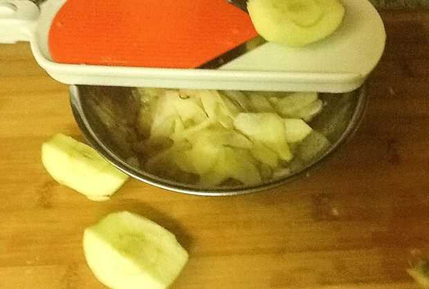 3) cuarto de la tercera manzana y quitar la base. Con una mandolina o cuchillo afilado, corte muy fino. Añadir a las manzanas ralladas.