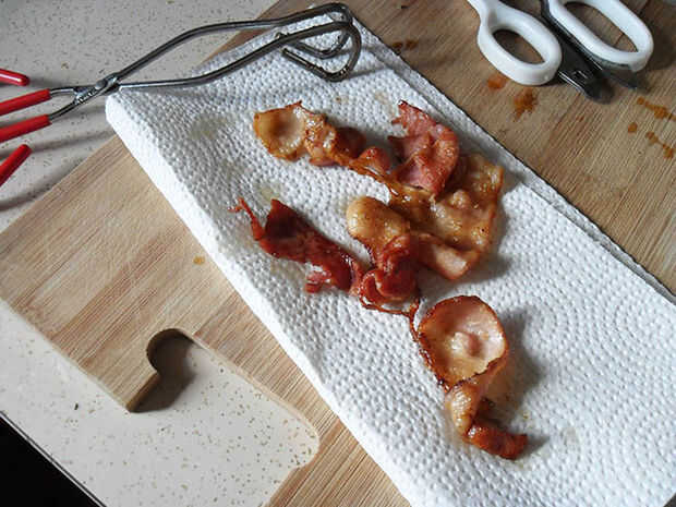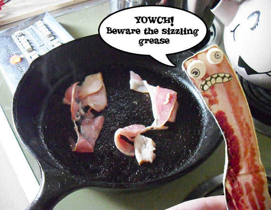 * Seguridad NOTA: Como siempre con tocino, ten cuidado con salpicaduras de grasa caliente y mangos de las ollas calientes!