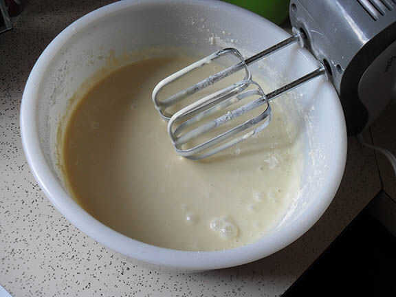 En este punto la mezcla estará espesa y grumosa. Cambiar a una batidora eléctrica mezclar la harina sin problemas y completamente.