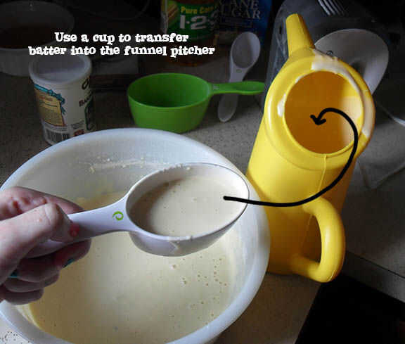 Transferencia de masa en un jarra de pastel embudo. Nuestro vino con un kit de inicio pero ya que hemos agotado de la mezcla. Puede utilizar un embudo normal con la receta si quieres, pero encuentro la jarra para ser principiante más amigable y menos sucia.