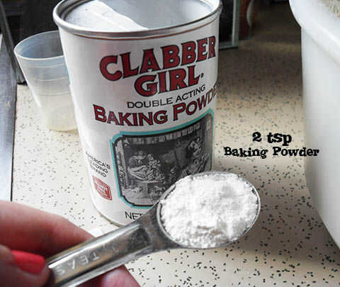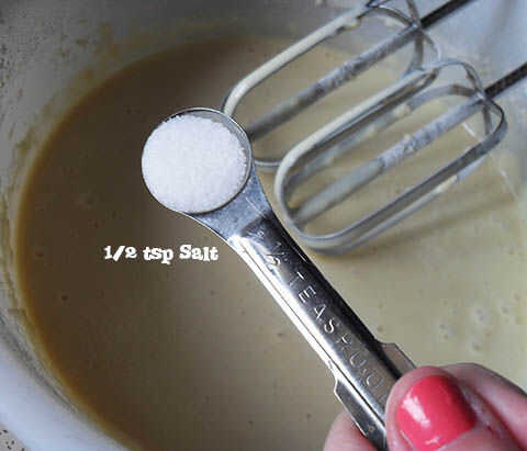 Agregar sal (1/2 cucharadita) de levadura en polvo (2 cucharaditas). Golpear con la batidora eléctrica, una última vez.