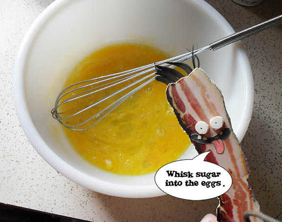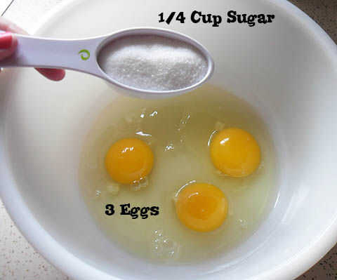 Combinar sus huevos (3) y (1/4 taza) de azúcar en un tazón. Bate hasta que quede mezclado.
