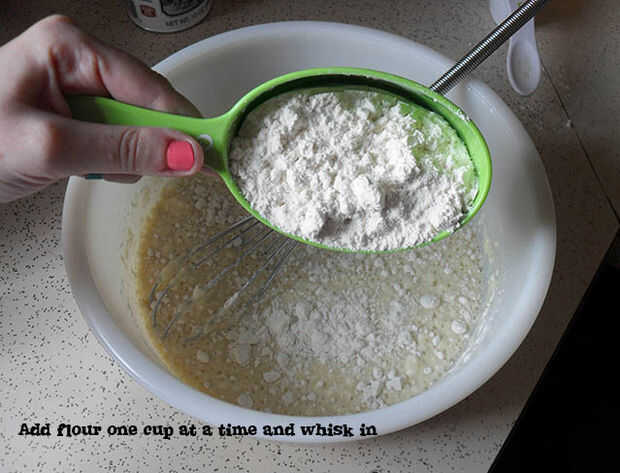 Ingredientes secos pueden ser agregados en cualquier orden. he añadido mi harina (3 tazas) en primer lugar, una taza a la vez y batiendo después de cada porción se le adicionó.