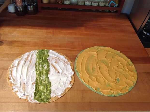 Ejemplos: Hummus y queso crema, pesto y crema fraiche, frijoles refritos y crema agria.