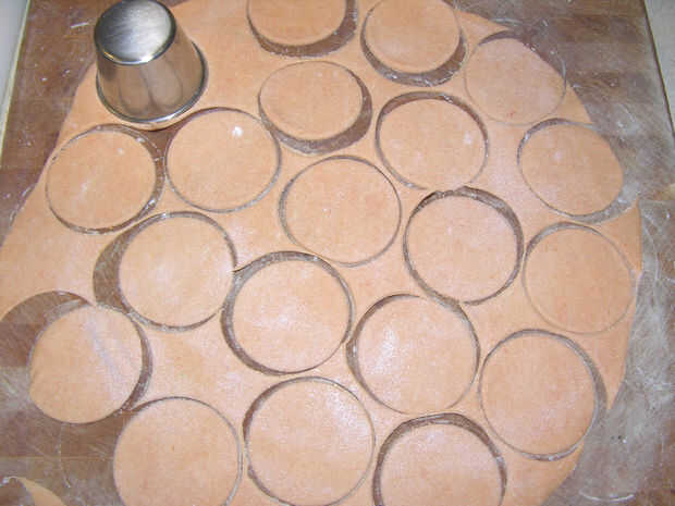 Doblar sobre el círculo para formar una media luna que contiene el relleno, pellizcar los bordes de la masa juntos.