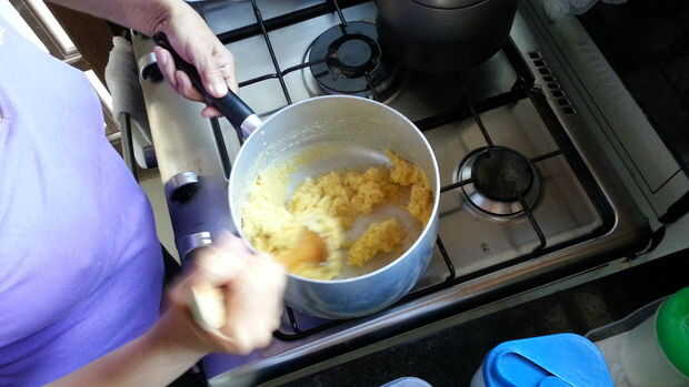 Com água fervendo colocar todos os ingredientes e mexer para homogeneizar. Quando desgrudar da panela espere esfriar.