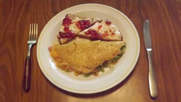 Tenía una hankerin' para una tortilla esta mañana - nada extravagante, apenas un huevo, rápido y fácil con un poco de jamón y queso. Mi tortilla no es demasiado bonita pero es mucho sabroso y sólo tomó unos minutos para hacer.Este es un plato súper f