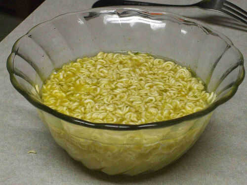 Después rompen los fideos, ponerlos en un tazón de cristal * y cubrir con agua, los fideos deben tener aproximadamente 2 pulgadas de agua debajo de ellos.
