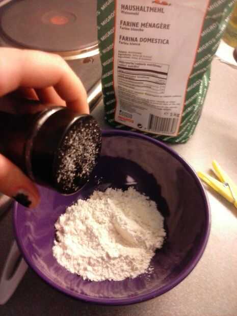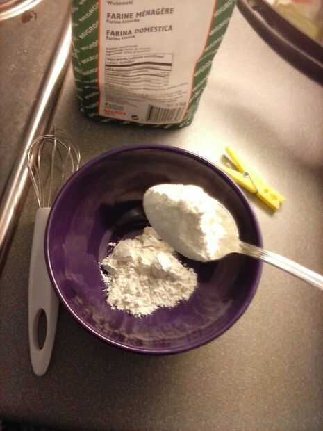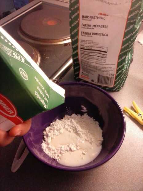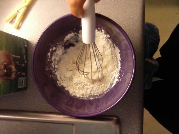 1. en un bol, poner la harina (será el termostato harina más gruesa y más difícil de cocinar). Puede comenzar con dos cucharas de harina y agregar más si lo necesita después de agregar el resto de los ingredientes.