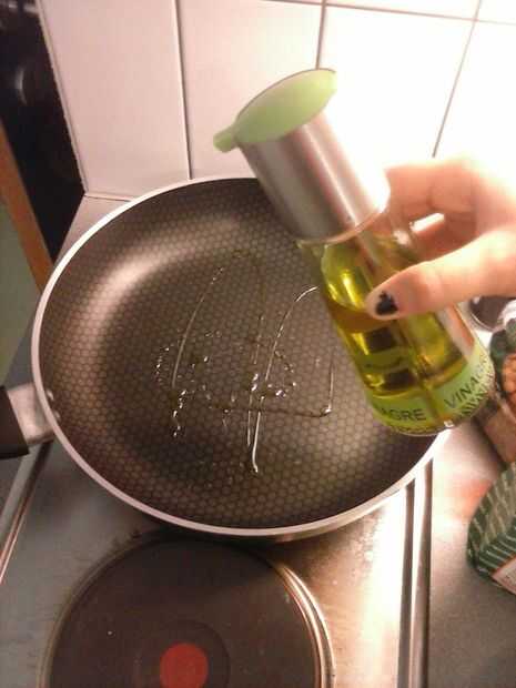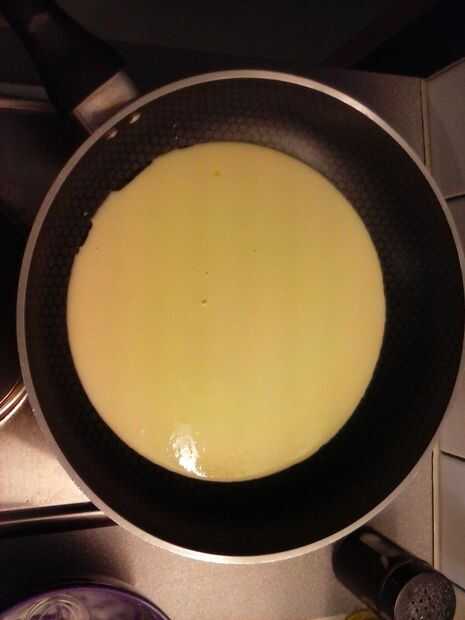 Poner aceite en una sartén (no demasiado, lo suficiente como para evitar que la tortilla se pegue en la sartén). Una vez que está caliente, deje caer la mezcla en él. Lanza todo en la cacerola.
