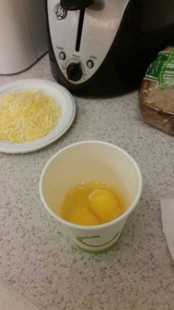 A continuación, agrietados un par de huevos en una taza de papel y mezclar con un tenedor de plástico.